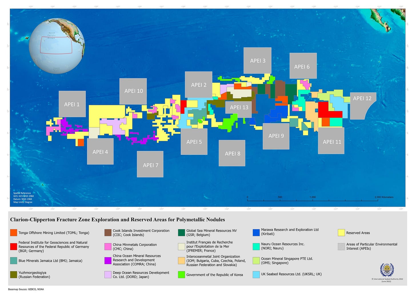 Human contact with polymetallic nodules is concentrated on the Clarion-Clipperton Fracture Zone, an area in the Pacific ocean where a number of countries explore possibilities for deep sea mining under the governance of the International Seabed Authority. Comprised of 117 member states and responsible for 54% of the world’s oceans, the ISA is tasked with the dual mandate of “organising and controlling all mineral resource activities in the area for the benefit of humankind as a whole”, as well as ensuring effective protection of the natural environment.